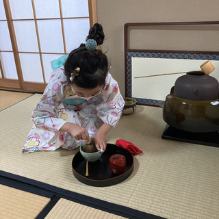 小学二年生のお嬢ちゃんです、買って貰ったばかりの浴衣でお稽古です。お父さんにお茶を点てています❣️